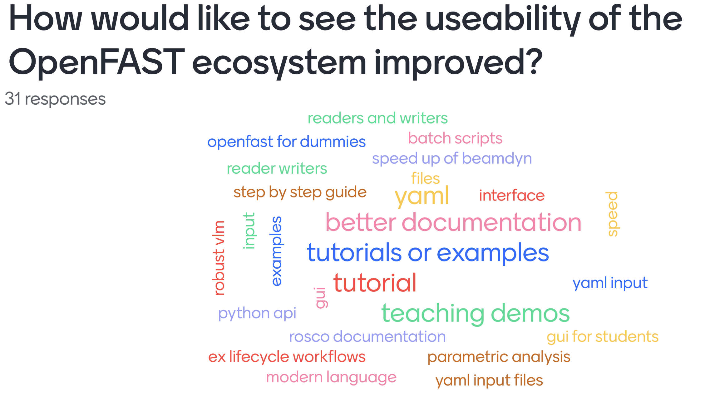 As an indicative example, a poll in the OpenFAST workshop asked attendees to write in their top priorities and displayed the answers in a word cloud. Of the 31 responses, 26 were related to accessibility issues.