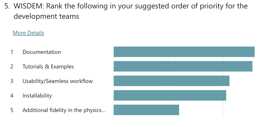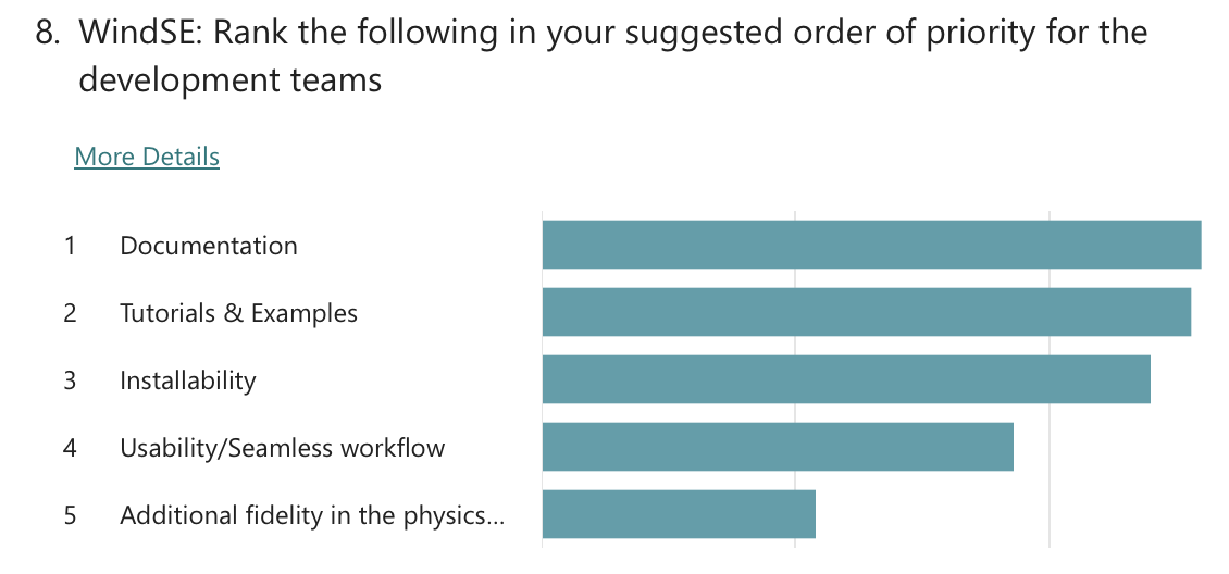 Polls were conducted to understand the community’s priorities around future development of the WETO Stack. The questions evolved throughout the series of workshops, but the results overwhelmingly indicate that the community supports focusing on usability and accessibility improvements. Specifically, “Documentation” and “Tutorials & Examples” were the clear favorite with “Installability” and “Usability / Seamless workflows” coming after.